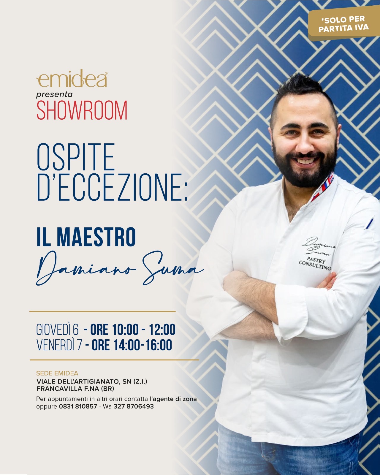 A rendere ancora più speciale l’evento, ci sarà un ospite d’eccezione: il Maestro Pastry Chef Damiano Suma, noto per la sua abilità nel fondere tradizione e innovazione con eleganza e gusto. Damiano sarà presente per due dimostrazioni esclusive: