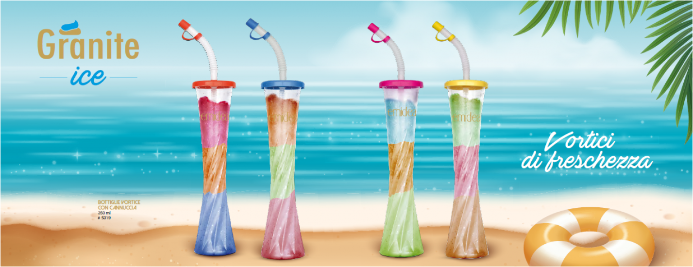 La granita adatta ai bambini, per una pausa golosa e refrigerante in simpatiche bottiglie. Veri vortici di freschezza!